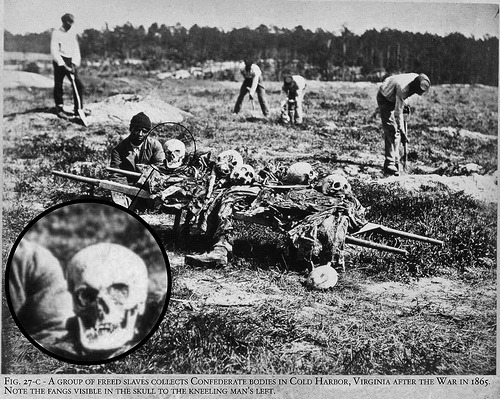 Skupina oslobodených otrokov zhromažduje telá vojakov v Cold Harbor, Virginia po vojne v roku 1865. Všimnite si tesáky, ktoré sú viditeľné na lebke naľavo od kľačiaceho muža.