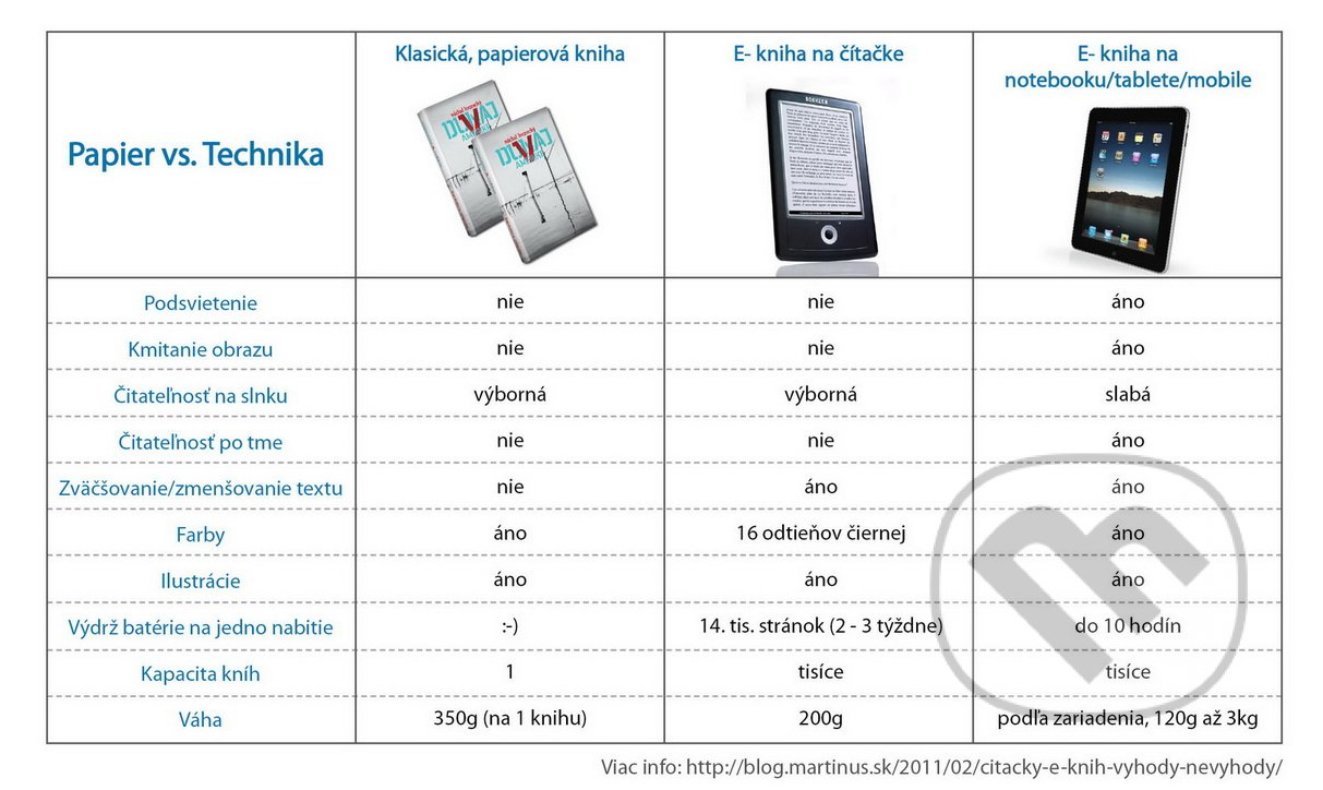 Kým na Západe už prepadli čaru čítačiek a e-kníh milióny ľudí, nás to ešte len čaká. Mnohým ľuďom vadí, že pri čítačke chýba “pocit knihy”. Prevracanie stránok, vôňa čerstvo vytlačenej knihy a podobne. Mnohí ešte nemali príležitosť stretnúť sa s čítačkou a nevedia si predstaviť, ako môže displej vyzerať ako vytlačený text. Faktom ostáva, že čítačky založené na e-inku používajú takmer výhradne čiernobiely displej, ktorý sa nehodí na publikácie založené na farebných ilustráciách. Dokáže ich síce zobraziť, ale len v 16 odtieňoch šedej. Kým v USA už e-knihy v predajnosti pomaly predbiehajú klasické, papierové knihy, u nás je ponuka zatiaľ obmedzená. Na Martinus.sk sa síce neustále rozširuje a každý deň pribúdajú nové a nové tituly, ale dosiahnuť rovnakú úroveň ako v západných krajinách si bude vyžadovať ešte množstvo času, úsilia a ochoty zo strany vydavateľov.