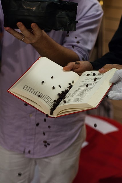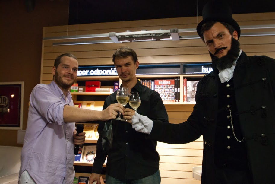 O šiestej nasledoval krátky príhovor Štúra, ktorý odmietol mikrofón “lebo ani v uhorskom sneme ho nepoužíval” a po ňom ešte kratšie preslovy spolumajiteľov Martinusu a Shtoora. Následne bola naša prvá spoločná “kníhkaviareň” pokrstená, ako sa patrí! Knihou a kávou. 🙂 Po samotnom obrade už na všetkých čakalo pohostenie, ktoré zase raz potvrdilo, že pohár vína najlepšie chutí v spoločnosti knihy a ľudí, ktorí ich milujú.