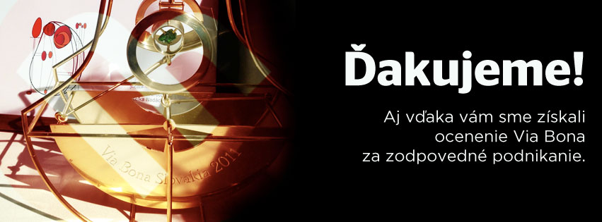 aj vďaka vám sme dosiahli ďalší krásny úspech! Od nadácie Pontis sme dostali hlavnú cenu pre malé a stredné podniky za zodpovedné podnikanie Via Bona 2011! Tento úspech nás nesmierne teší a chceme sa oň podeliť aj s vami, ktorí ste jeho základom. Preto sme sa rozhodli a v stredu 18.4.2012 bolo poštovné zadarmo!