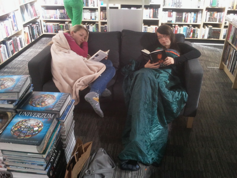 Konečne nastal deň D a chvíľu pred ôsmou hodinou večer sme začali vyzerať prvých hostí. Spoznať sa dali ľahko – väčšina z nich mala totiž na chrbte batoh, v ruke karimatku a v očiach nadšenie správneho knihomoľa, ktorý sa ocitne medzi tisíckami kníh! 🙂