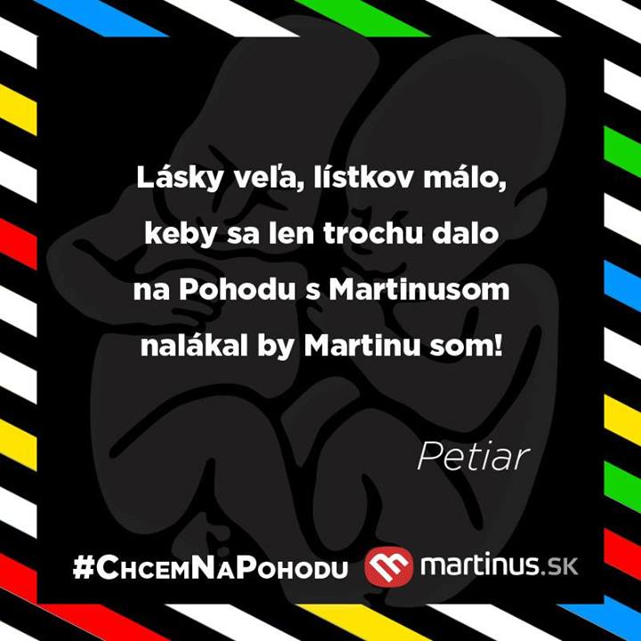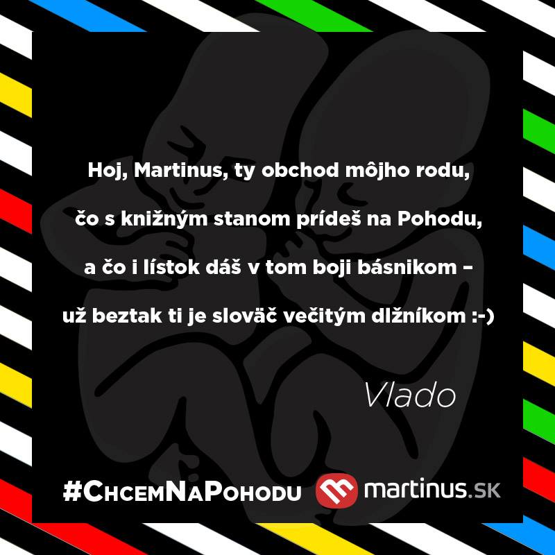 Tešíme sa na vás v Literárnom stane Martinus.sk na festivale Bažant Pohoda. TU nájdete program, ale vedzte, že to ani zďaleko nie je všetko, čo sme si pre vás pripravili. Ešte raz ďakujeme všetkým za účasť v súťaži a nezúfajte, o rok určite vymyslíme opäť niečo nové a zábavné. 🙂