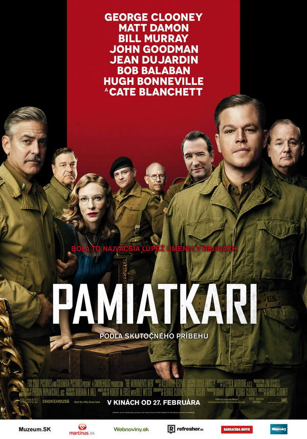 Od 27. februára si môžete v kinách vychutnať akčnú drámu Pamiatkari, v ktorej sa predstaví George Clooney v jedinečnej štvorkombinácii režisér – scenárista – producent – herec. Herecké obsadenie dopĺňajú nemenej zvučné mená ako Matt Damon, Bill Murray, John Goodman, Jean Dujardin, Bob Balaban, Hugh Bonneville či Cate Blanchett.